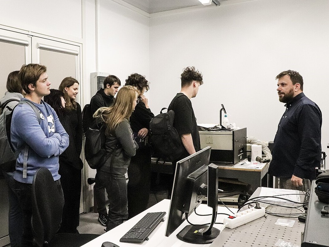 Following the presentations, the students toured several laboratories. Their first stop was the Laboratory of Spectroscopy, one of the largest laboratories of the ISSP UL, where they learned about research methods involving optical, magnetic, and electron spectroscopy. The tour continued at the Laboratory of Optical Materials, where the students gained insights into studying optical phenomena in various materials.